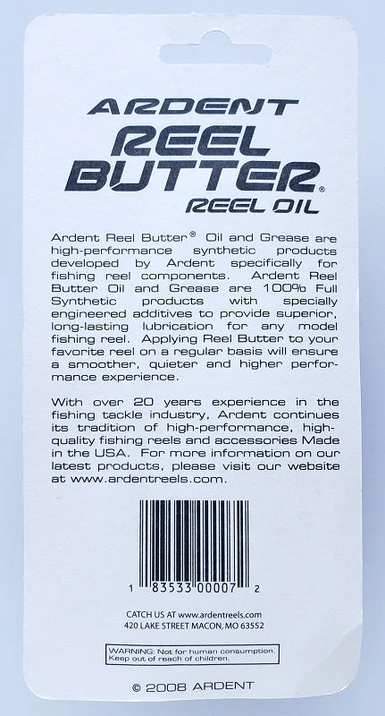 Ardent Reel Butter Oil is a high performance fully synthetic lubricant designed for fishing reels. Reel Butter Oil penetrates critical components like ball bearing systems, shafts, and other wear points. It has a super low viscosity and high surface tension to reduce wear and noise. This reel lubricant performs consistently under a wide range of temperatures and works equally well on saltwater and freshwater fishing reels. Reel Butter Oil also contains an anti-gumming agent to ensure ample lubrication for your favorite fishing reels.