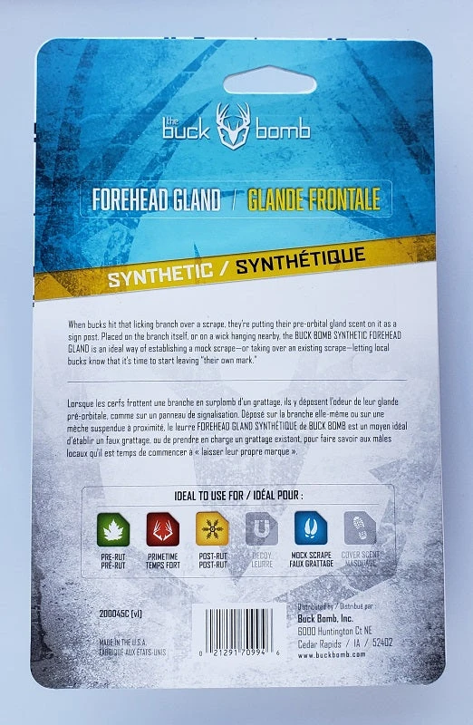 Forehead Gland imitates the scent that comes from the forehead of a whitetail buck when he makes a rub. Perfect for use over mock scrapes or existing scrapes to make local bucks think there’s an intruder in the area. This synthetic formula can be used in areas where natural urines are not allowed, including Canada.