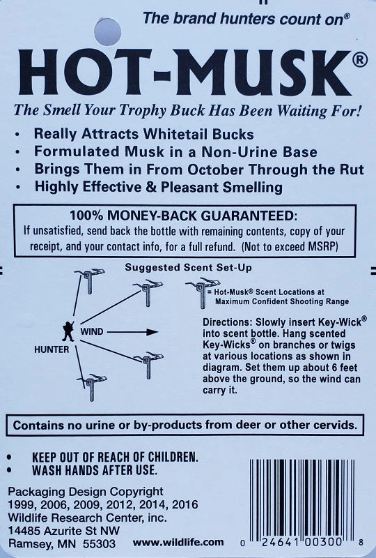 Wildlife Research #300 Hot Musk is a unique mixture of secret musk scents, blended together to create a highly effective buck lure that is also irresistible to does. Developed by Wildlife Research and extensively field-tested with remarkable results. Hot Musk really attracts the Whitetail Bucks. Highly effective October through December.