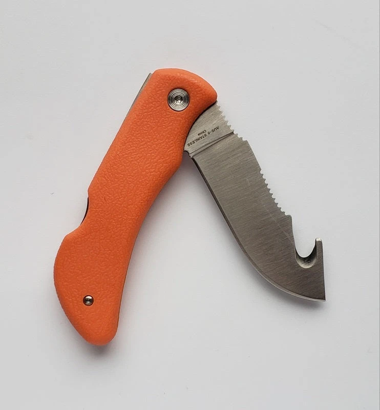 This folding gut-hook skinner is the perfect compact and lightweight hunting knife. Features a 3.2 inch Japanese AUS-8 stainless blade that is precisely heat treated and hand finished shaving-sharp for superior edge retention and performance. The gut-hook opens game like a zipper without piercing internal organs. Rubberized orange TPR handle scales are mounted to sturdy stainless steel liners for unparalleled strength and a secure, non-slip grip, even when wet. The blaze-orange handle is easy to spot on the ground, saving valuable time in the field while preventing loss. Each knife comes complete with a Mossy Oak® camo belt sheath with H-style belt loops for both vertical and horizontal carry options.