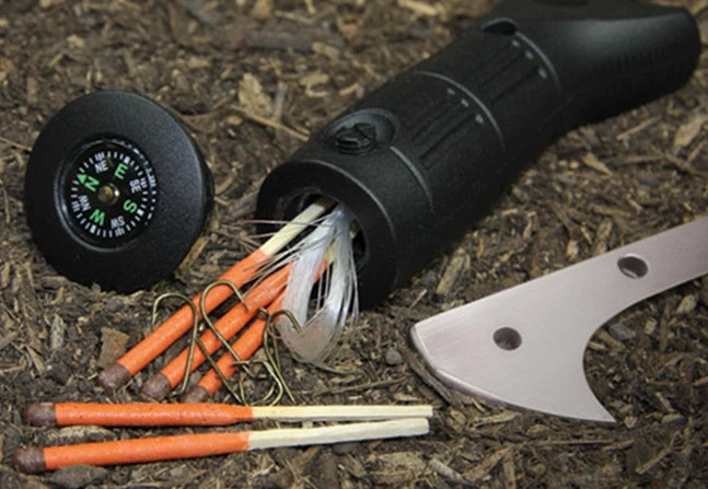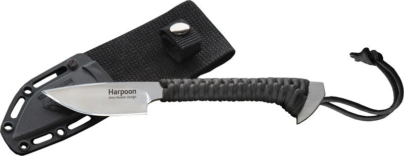 This practical outdoor knife easily converts to a harpoon/spear by slotting a green shaft and tying the knife in place, or by threading the black blade holder onto a standard broom handle. To convert to a harpoon, the 550 Paracord handle can be easily removed and used to lash the blade into the blade holder or green shaft. The hawksbill end of the handle is an effective inletting tool for carving a slot into a green shaft to accommodate the blade. The hollow handle blade holder features a storage compartment for matches, fire starters, fish hooks and other emergency essentials. Includes a liquid filled compass in the blade holder cap. The Harpoon comes complete with a quality nylon belt sheath which converts to a blade cover by removing the belt loop. Designed by custom knife maker Jerry Hossom. Patents Pending.Â